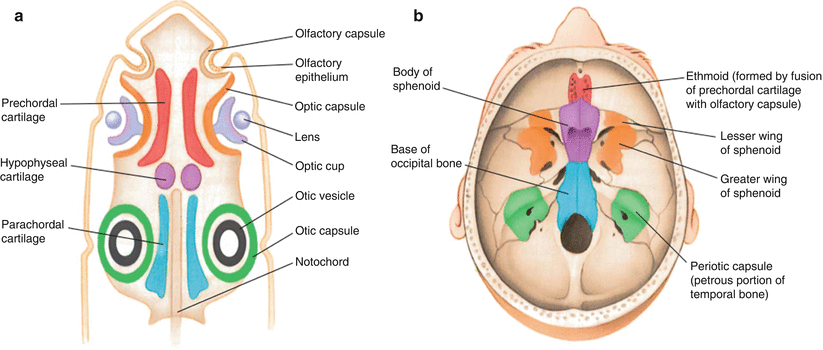 During development, bones of the skull base ossify in cartilage (i.e. endochondral ossification). They include the basioccipital, basisphenoid, petrous temporal and ethmoid bones. The skeletal capsules that house and protect the special sense organs also contribute to the skull base: the olfactory capsule contributes to the ethmoid bone, the optic capsule to the sphenoid bone and the otic capsule to the petrous temporal bone.